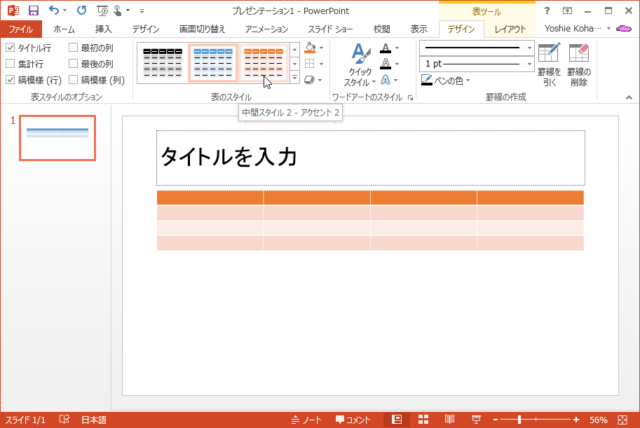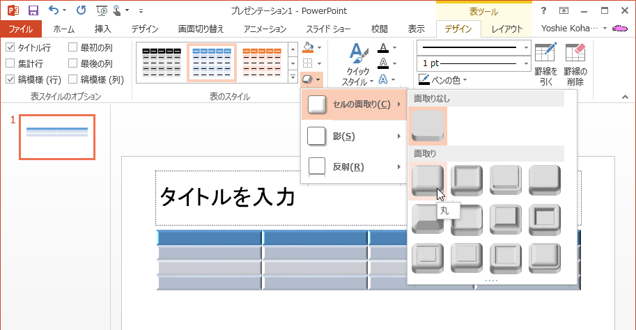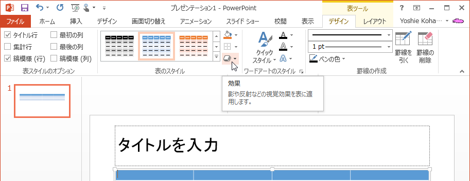 PowerPoint 2013で[表ツール]の[デザイン]タブのクイックスタイルの一覧から適用したいスタイルをクリックします。また、表に影や反射などの視覚効果を加えることも可能です。