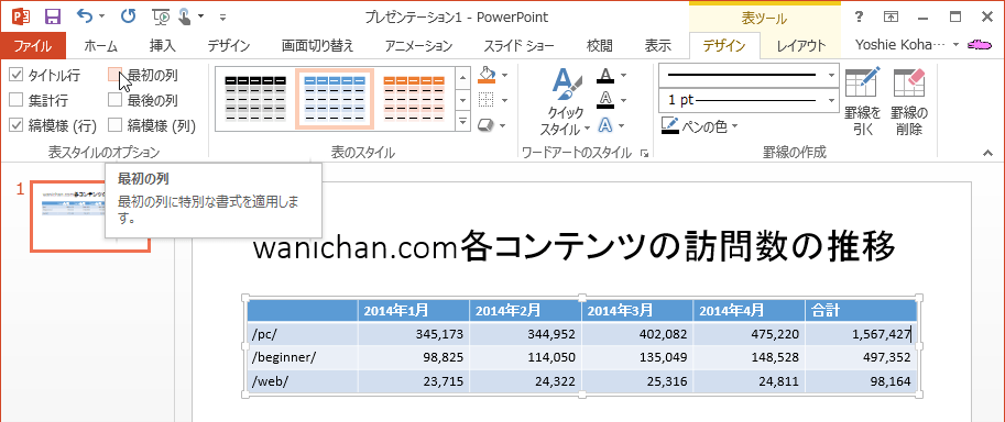 - [デザイン]タブの[表スタイルのオプション]グループのなかから[最初の列]にチェックを付けます。