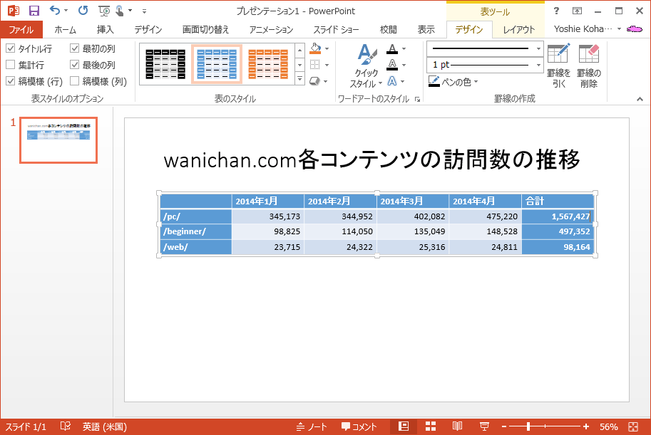 既定の設定では最初の行が見出しとして設定され、1行ごとにコントラストの異なる縞模様が適用されています。最初の列を見出しにしたい、最後の行を集計行としたい場合など、PowerPoint 2013で表スタイルのオプションを設定する方法について説明します。