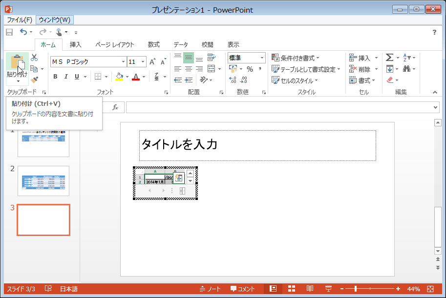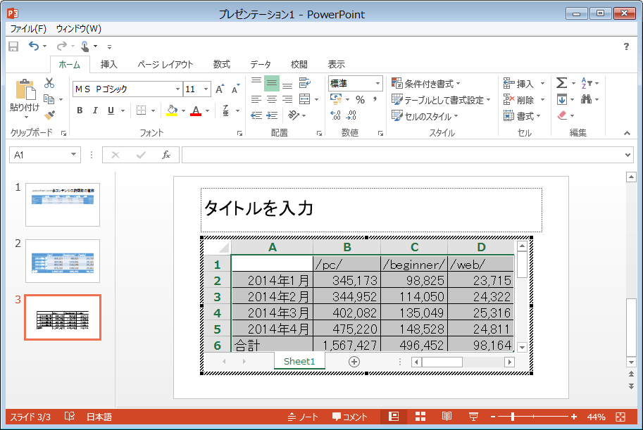 - PowerPointのスライド内のExcelワークシートに貼り付けます。