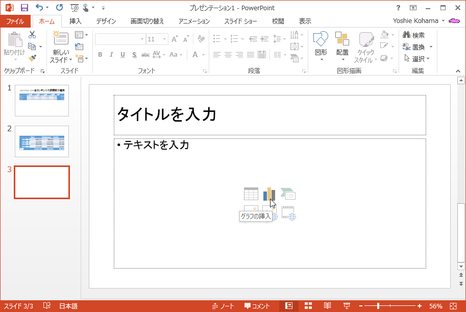 - 新しいスライド(タイトルとコンテンツ)を挿入して、コンテンツのプレースホルダの[グラフの挿入]をクリックします。