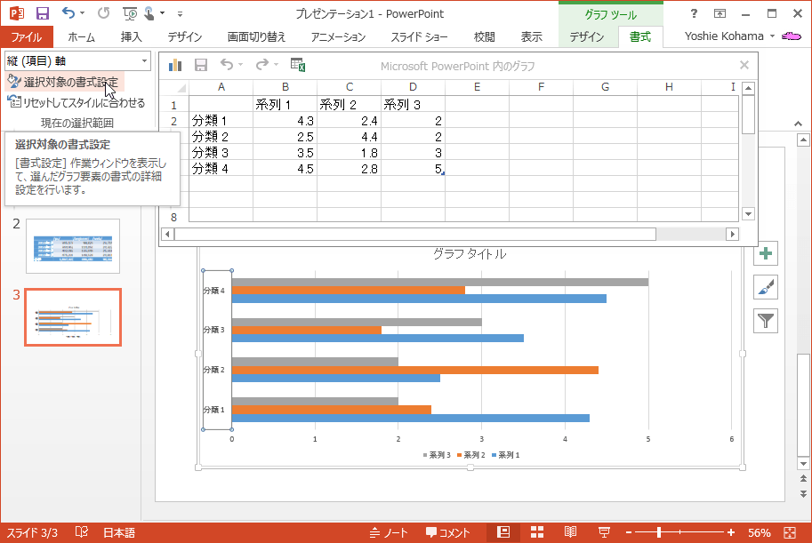 - [グラフツール]の[書式]タブを開き、[現在の選択範囲]グループの[選択対象の書式設定]をクリックします。