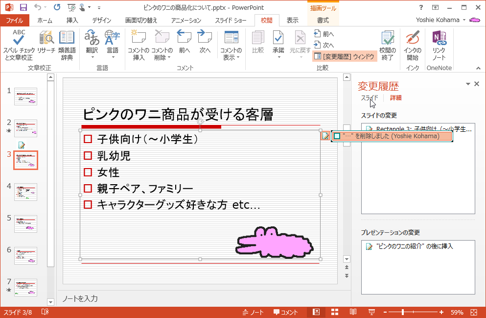PowerPoint 2013で他の校閲者によって修正された内容を比較するには、変更されたスライドを開き、[変更履歴]ウィンドウの[スライド]をクリックします。
