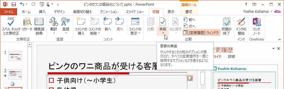 PowerPoint 2013で他の校閲者によって変更された履歴を承諾したり、反映したりするには、変更内容の部分のチェックボックスにチェックを付けるか、[校閲]タブの[比較]グループの[承諾]をクリックします。すべての変更内容を反映するには[校閲]タブの[比較]グループの[承諾]の▼をクリックして[このスライドのすべての変更を反映]または[このプレゼンテーションのすべての変更を反映]を選択します。