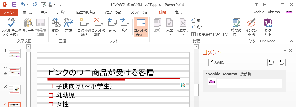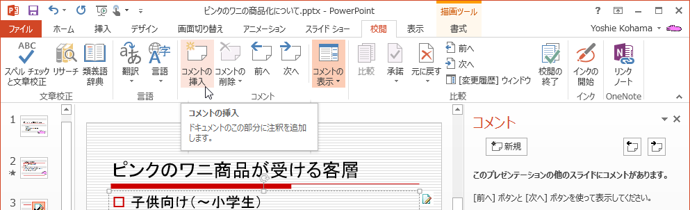 [校閲]タブの[コメントの挿入]、コメントウィンドウが表示されている場合は