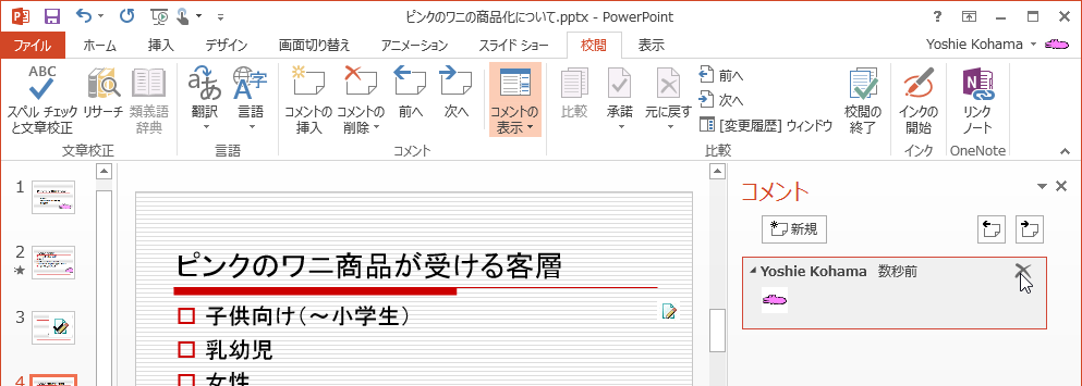 コメントを削除するには、削除したいコメントを選択してDeleteキー、もしくは[コメントの削除]をクリックします。