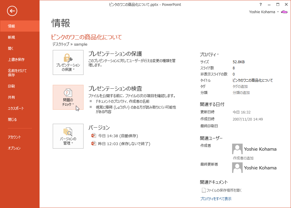 - プレゼンテーションに隠しメタデータや個人情報がないかどうかチェックするには、[ファイル]タブを開き、[情報]タブの[ドキュメントの検査]の[問題のチェック]ボタンをクリックします。