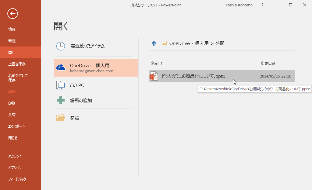 すでにPowerPointプレゼンテーションが開いている場合は、[ファイル]タブの[開く]から、PowerPoint 2016起動時のスタート画面からは[他のプレゼンテーションを開く]を選択して、OneDriveのアカウントから開きたいファイルを選択します。