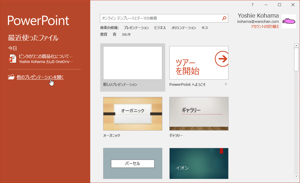 - PowerPoint 2016を起動時にスタート画面が表示された場合は[他のプレゼンテーションを開く]を選択します。
