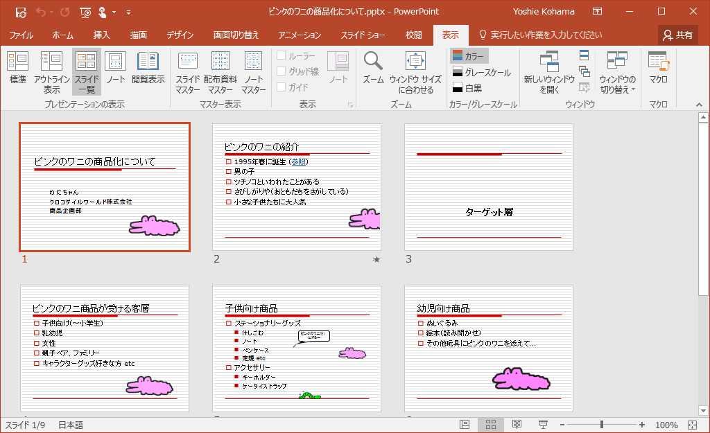 - [表示]タブを開き、[プレゼンテーションの表示]グループの[スライド一覧]をクリックします。