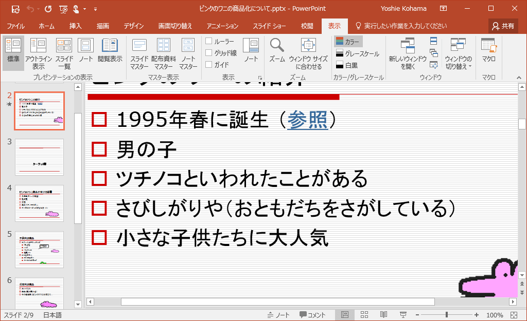 PowerPoint 2016で適切なレベルに拡大または縮小するには、[表示]タブの[ズーム]機能を使います。ズーム機能では、400%, 200%, 100%, 66%, 50%, 33% の倍率が用意されています。