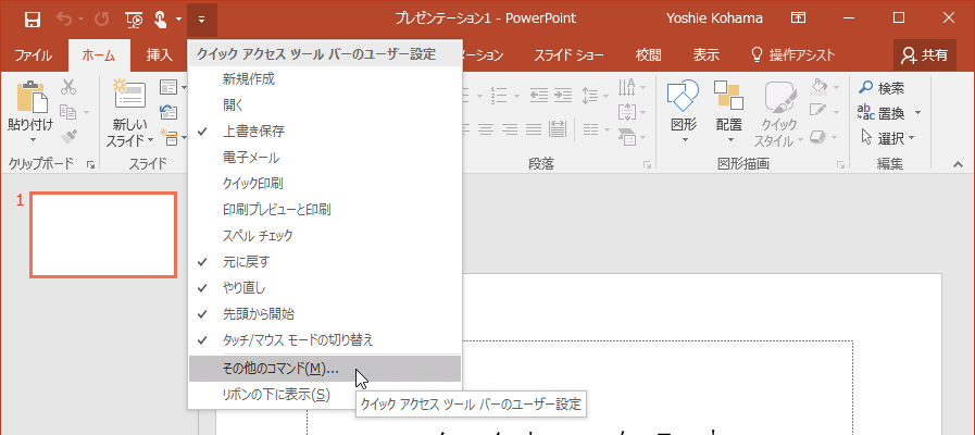 クイックアクセスツールバーの▼をクリックし、[その他のコマンド]から追加したいコマンドを選択します。[PowerPointのオプション]ダイアログボックスを開いて[クイックアクセスツールバー]からでも行えます。