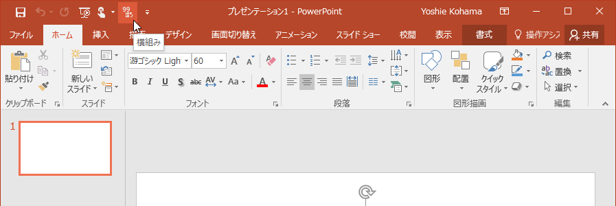 [リボンにないコマンド]カテゴリには、さまざまな便利なコマンドが用意されています。ここでは「横組み」コマンドを追加する方法について説明します。