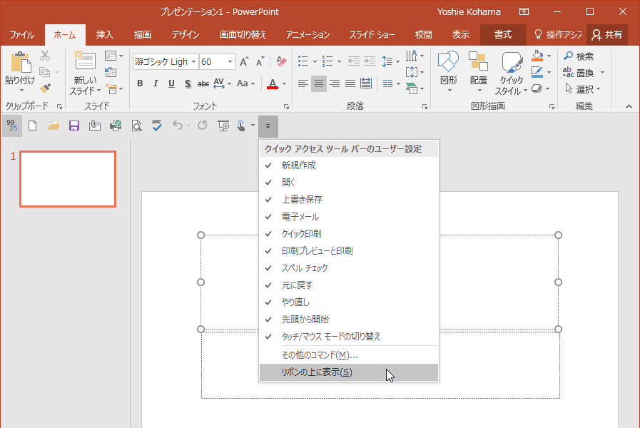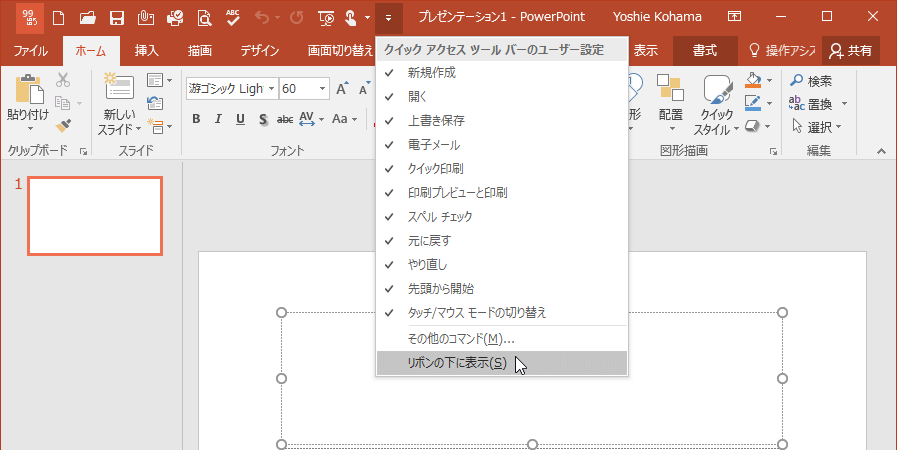 PowerPoint 2016のクイックアクセスツールバーは既定ではタイトルバーの左側に配置されていますが、リボンの下に移動することもできます。クイックアクセスツールバーの右側▼をクリックして、[リボンの下に表示]を選択します。リボンの下に移動することで、クイックアクセスツールバーに追加できるコマンドボタンをたくさん増やせます。