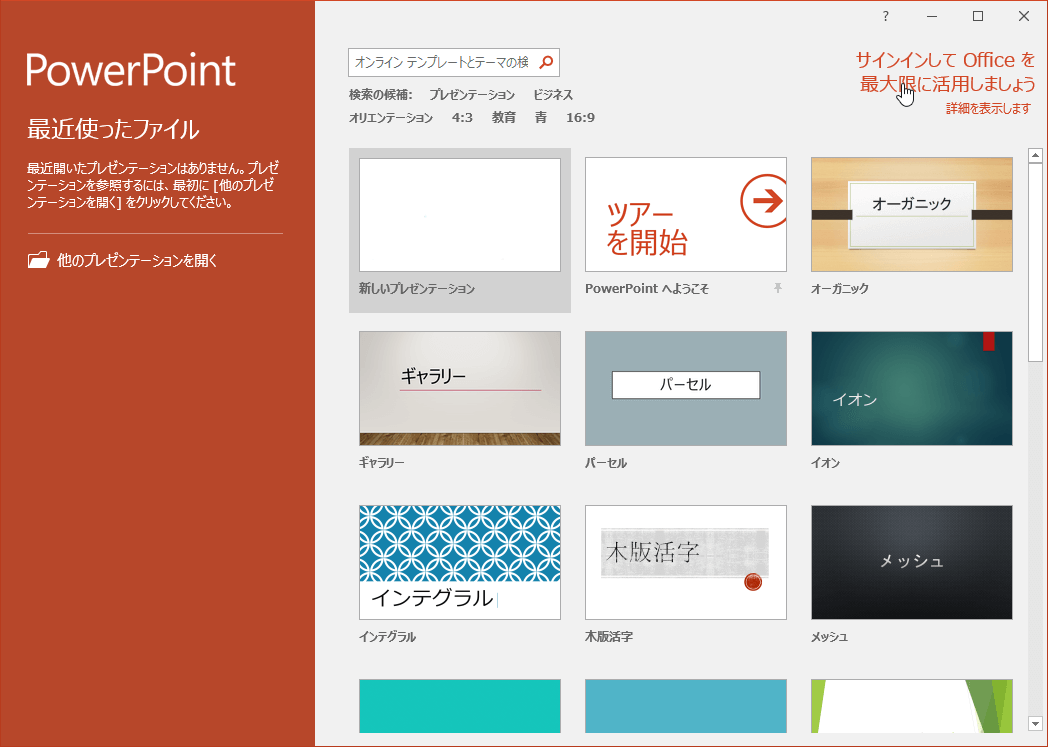 PowerPointを起動するとスタート画面が表示されます。画面右上の[サインインしてOfficeを最大限に活用しましょう]のリンクをクリックします。