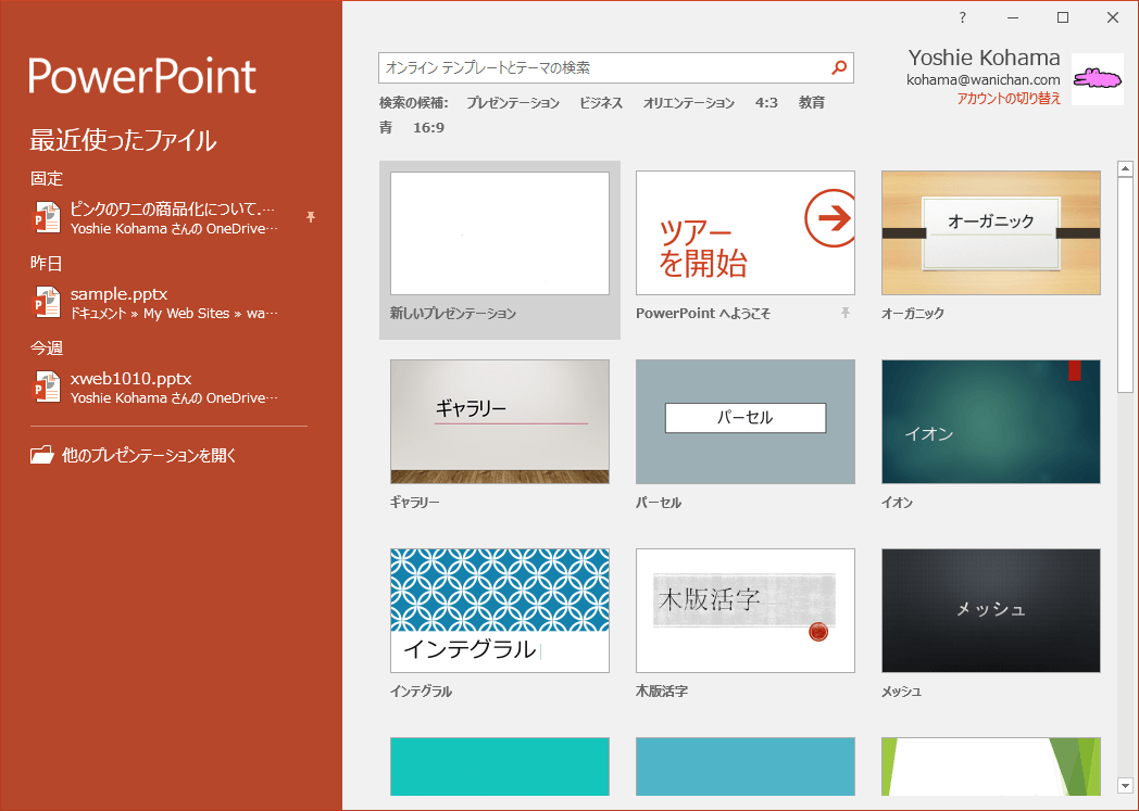 アカウントからサインアウトしてPowerPoint 2016を終了したあと、他の人がPowerPoint 2016を利用する場合、スタート画面の右上のサインインのリンクをクリックして、アカウントにサインインを行うとOKです。