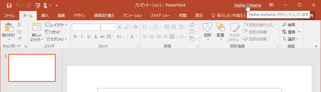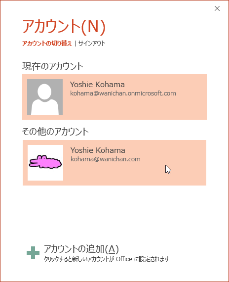 複数のアカウントを持っている場合は、アカウントを切り替えることができます。PowerPoint 2016画面右上のサインインされたアカウントをクリックして[アカウントの切り替え]を選択してサインインするアカウントを選択するか、[ファイル]タブを開き、[アカウント]タブを開いて[ユーザー情報]の[アカウントの切り替え]をクリックして切り替えるアカウントを選択します。