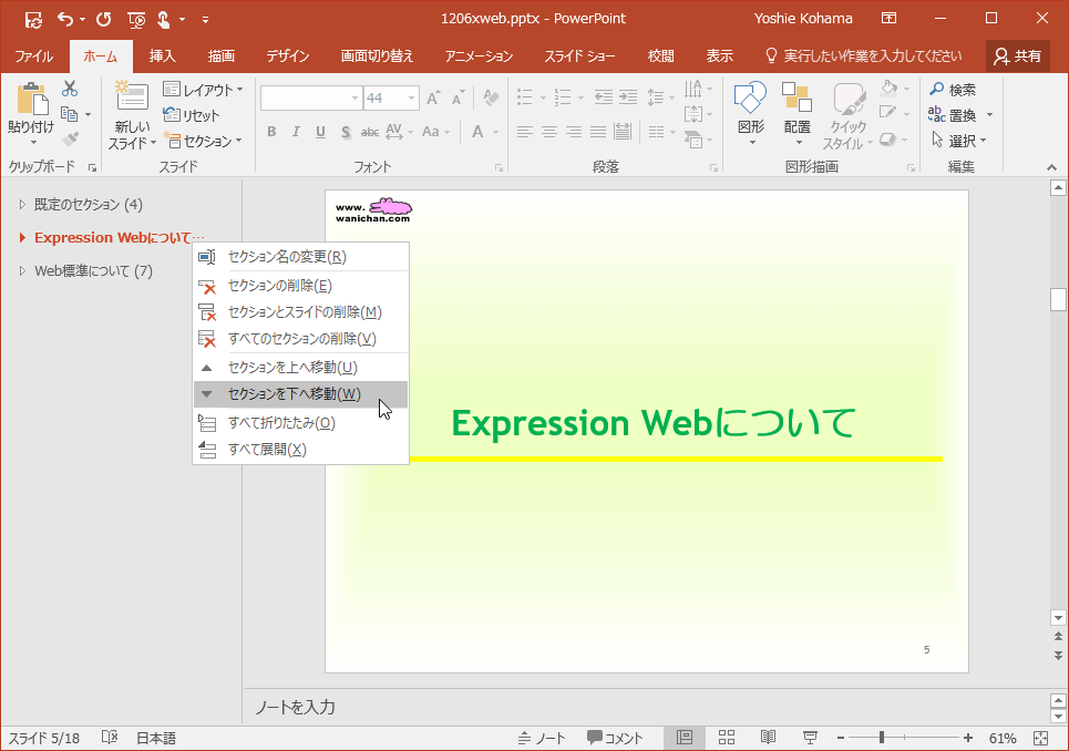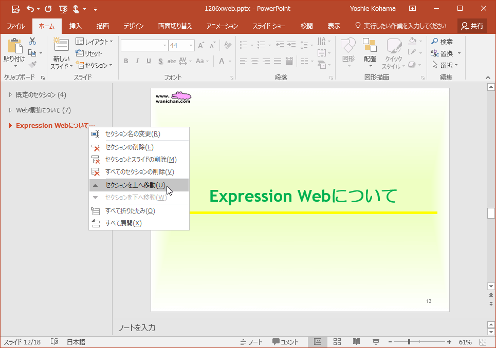PowerPoint 2016で対象となるセクションを右クリックしてショートカットメニューより[セクションを上へ移動]または[セクションを下へ移動]を選択することで、セクション単位の順序を変更できます。