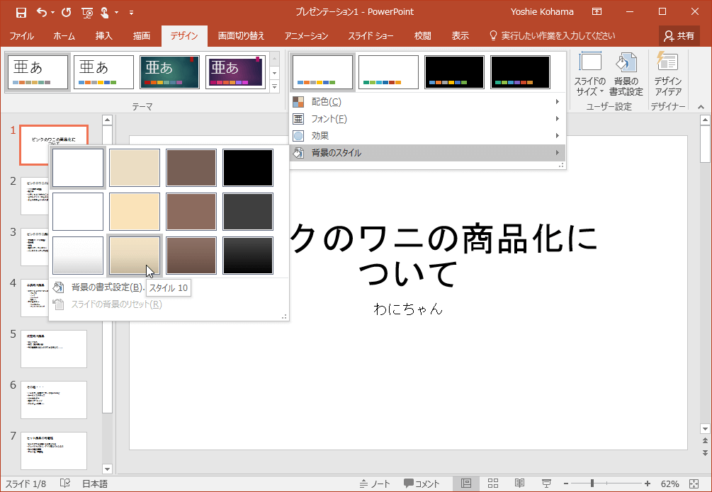 - [デザイン]タブを開き、[バリエーション]の▼をクリックし、一覧から[背景のスタイル]をポイントして、一覧から背景のスタイルを選択します。
