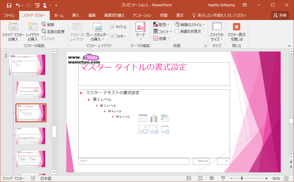 - タイトルレイアウト以外のすべてのレイアウトにもそのロゴが反映されていることを確認します。