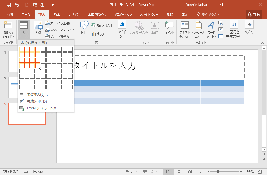 新しいスライドに表を挿入する