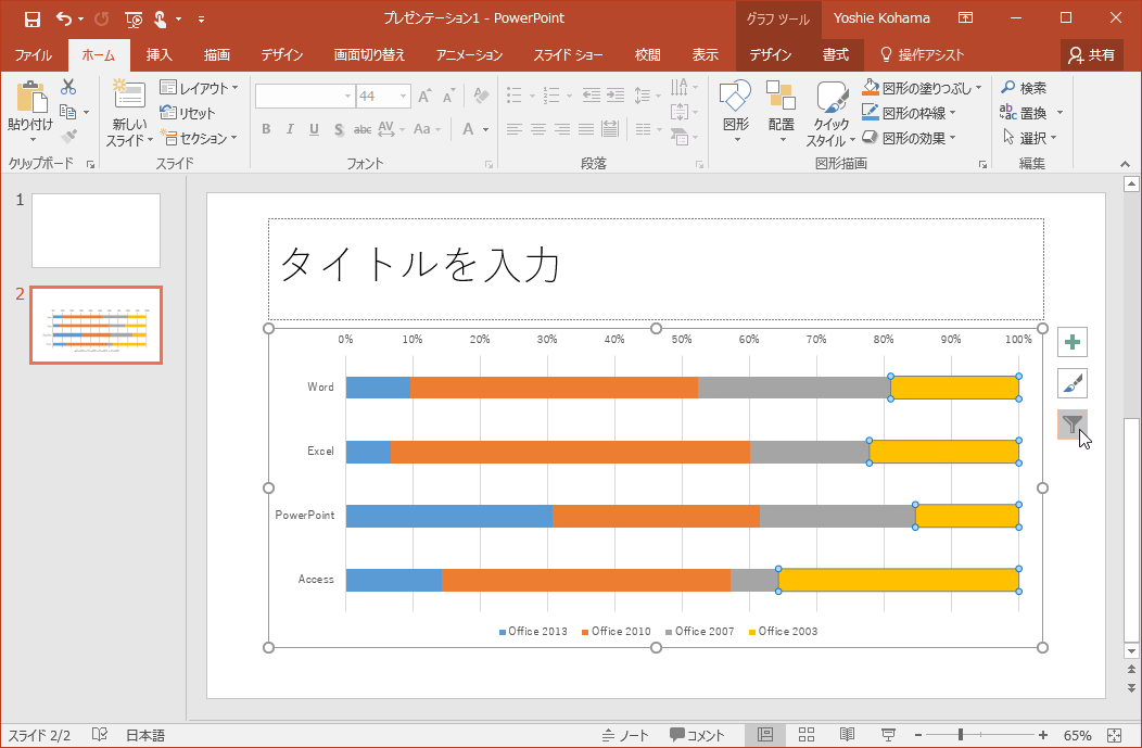 PowerPoint 2016でデータ系列やカテゴリ単位でデータをすばやく絞り込むには、グラフを選択したときに右側に表示される3つのボタンのうち、一番下の[グラフフィルター]ボタンを利用するとOKです。