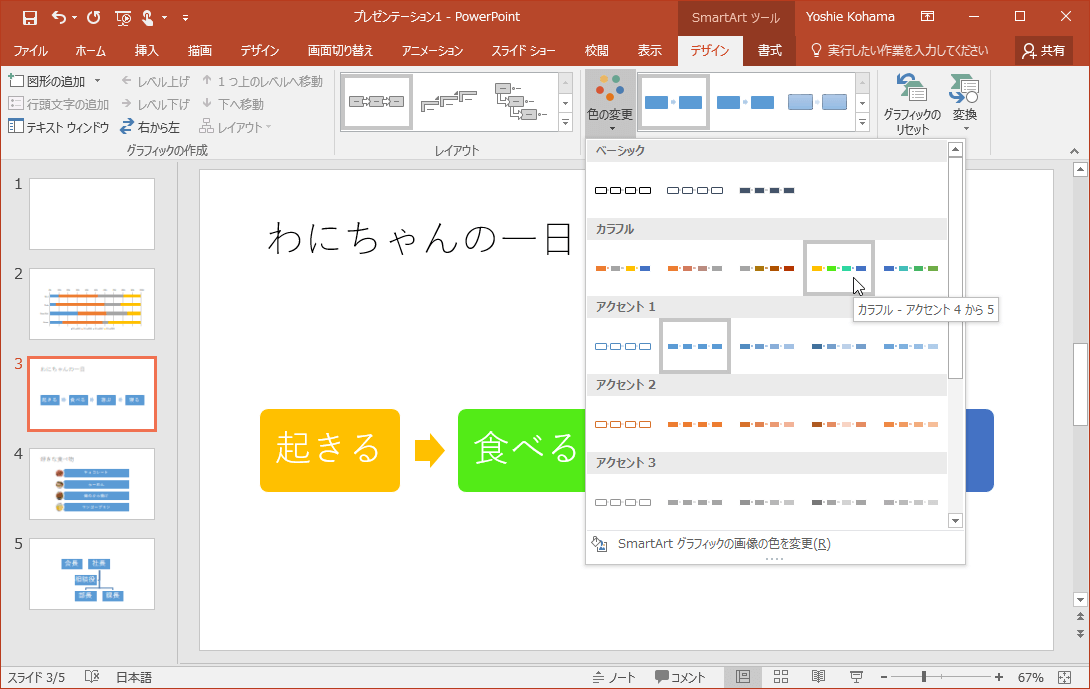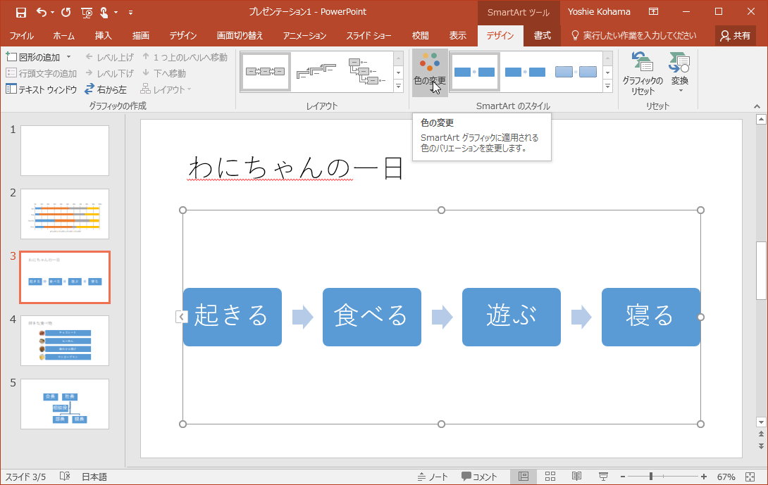 - [SmartArtのスタイル]グループの[色の変更]をクリックします。