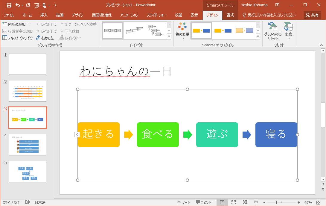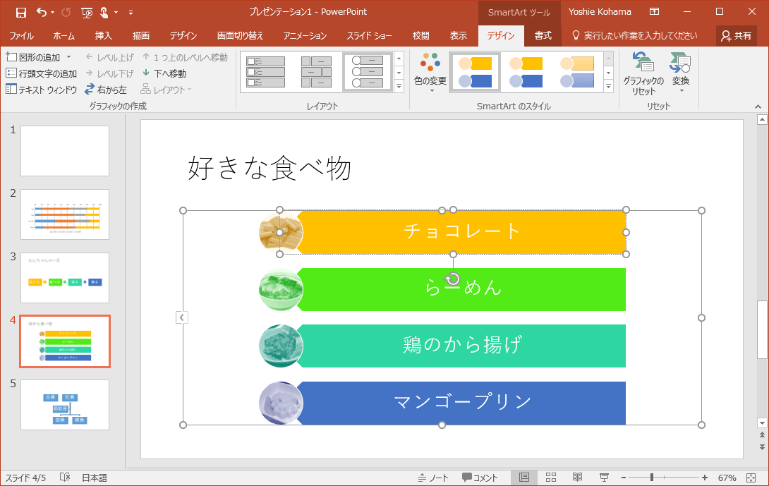 - SmartArtを選択して、[SmartArtツール]の[デザイン]タブを開きます。