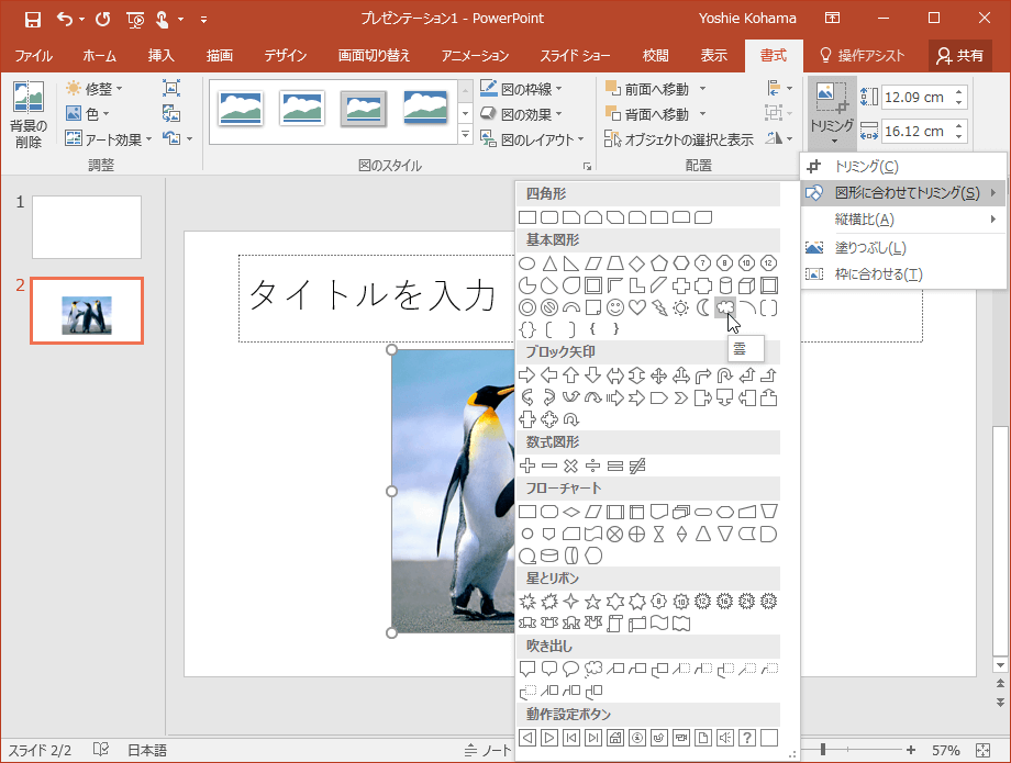 - [図形に合わせてトリミング]をポイントして、一覧から図形を選択します。