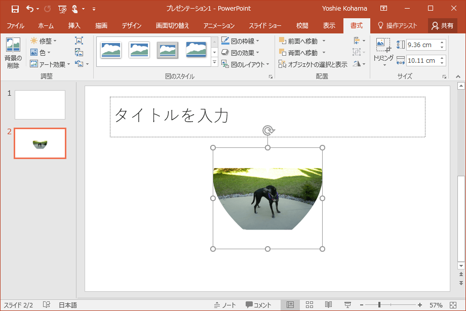 PowerPoint 2016で図のサイズを変更し、図の全体が元の縦横比を維持したまま図の領域内に表示されるようにするには、対象となる図を選択して[図ツール]の[書式]タブを開き、[トリミング]の▼をクリックして[枠に合わせる]を選択します。