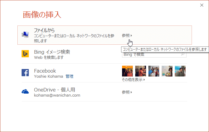 - [画像の挿入]ウィンドウから変更したい画像の場所を指定します。ここでは[ファイルから]を選択します。