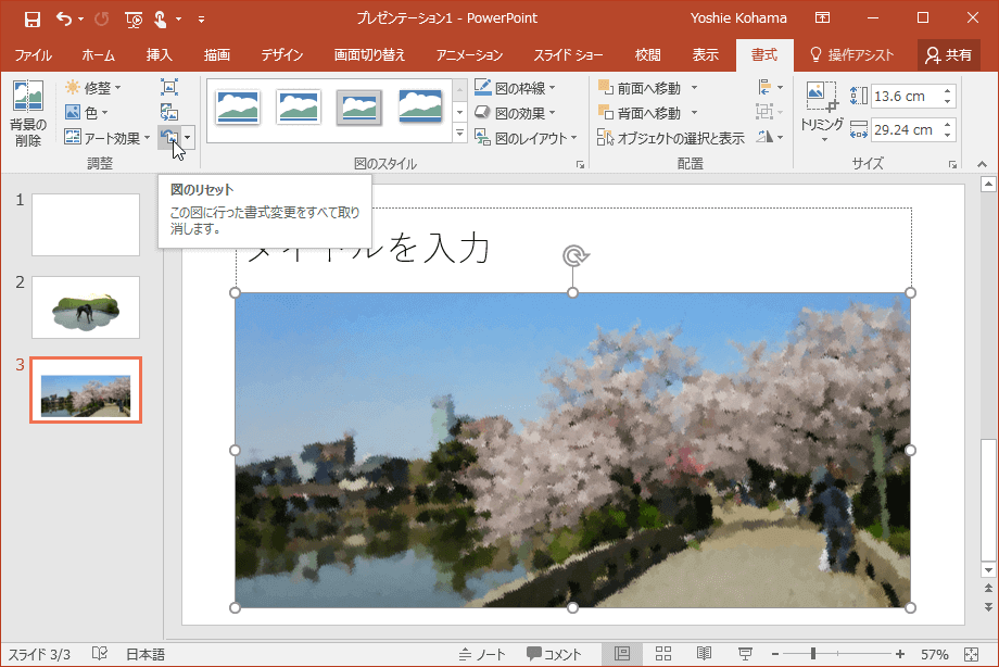 - [図のリセット]ボタンをクリックします。
