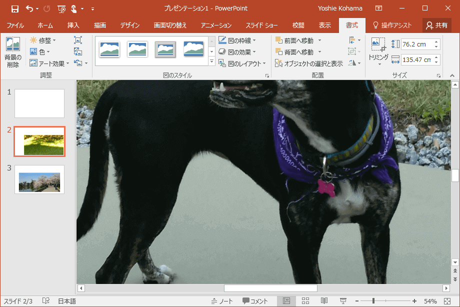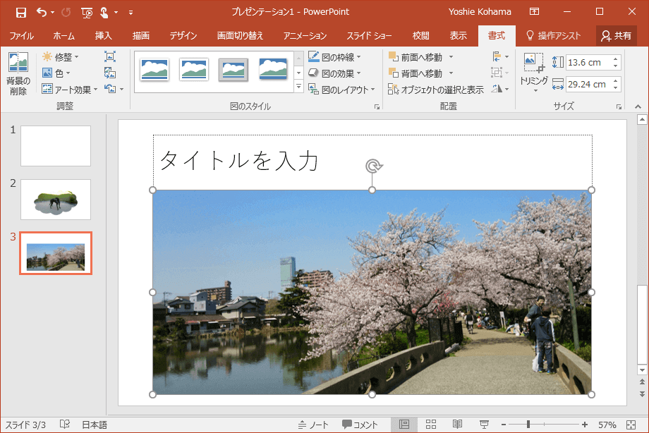 - 図を選択して[図ツール]の[書式]タブを開きます。