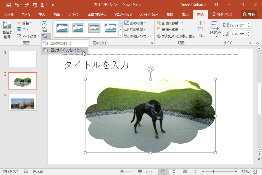 - [図のリセット]ボタンの▼をクリックして、[図とサイズのリセット]を選択します。