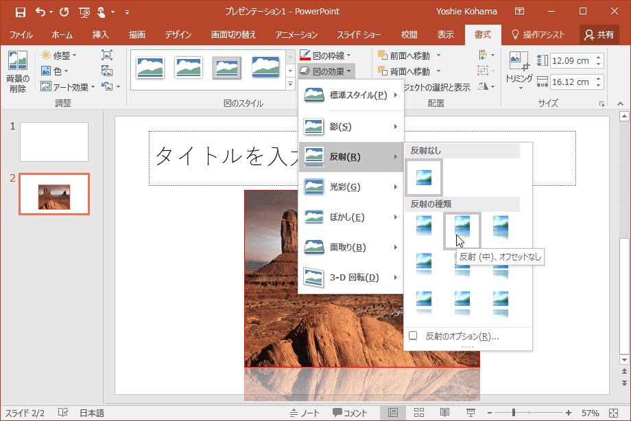 - サブメニューより[反射]をポイントして、反射のパターンを選択します。