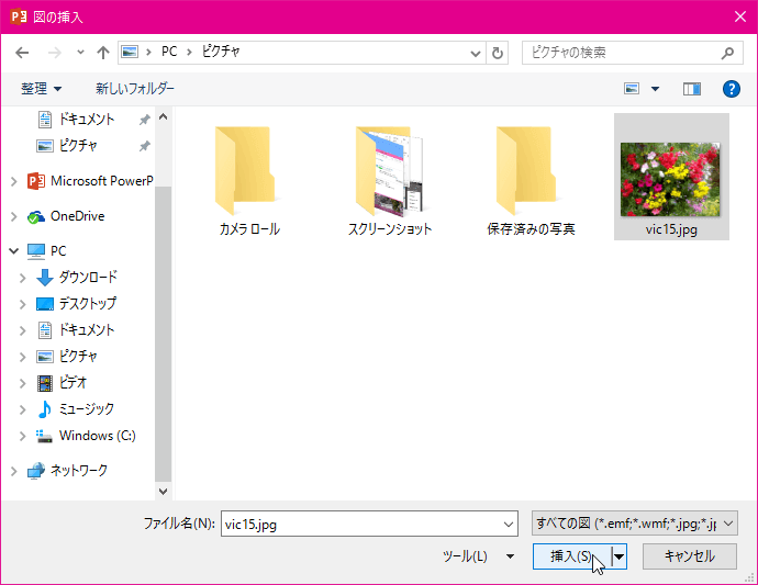 - 挿入したい画像を選択して[挿入]ボタンをクリックします。