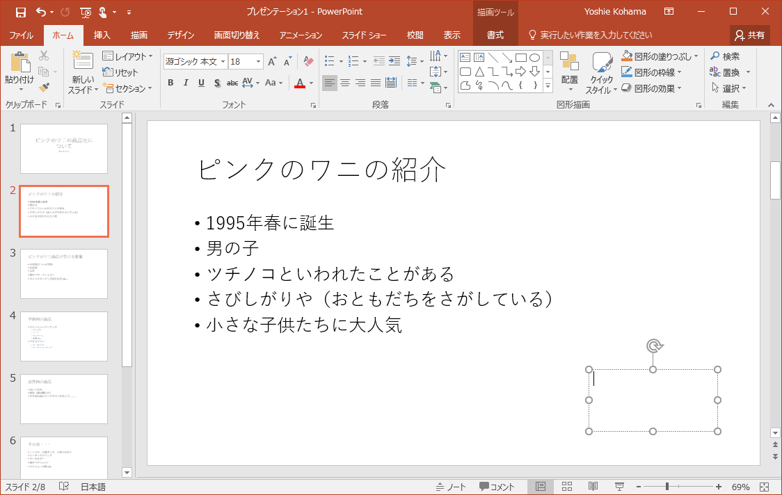 PowerPoint 2016でスライド内の任意の場所にテキストボックスを挿入するには、[挿入]タブの[テキストボックス]を選択して、横書きまたは縦書きのテキストボックスを選択します。[ホーム]タブの[図形描画]グループの[図形]一覧にもテキストボックスが用意されています。