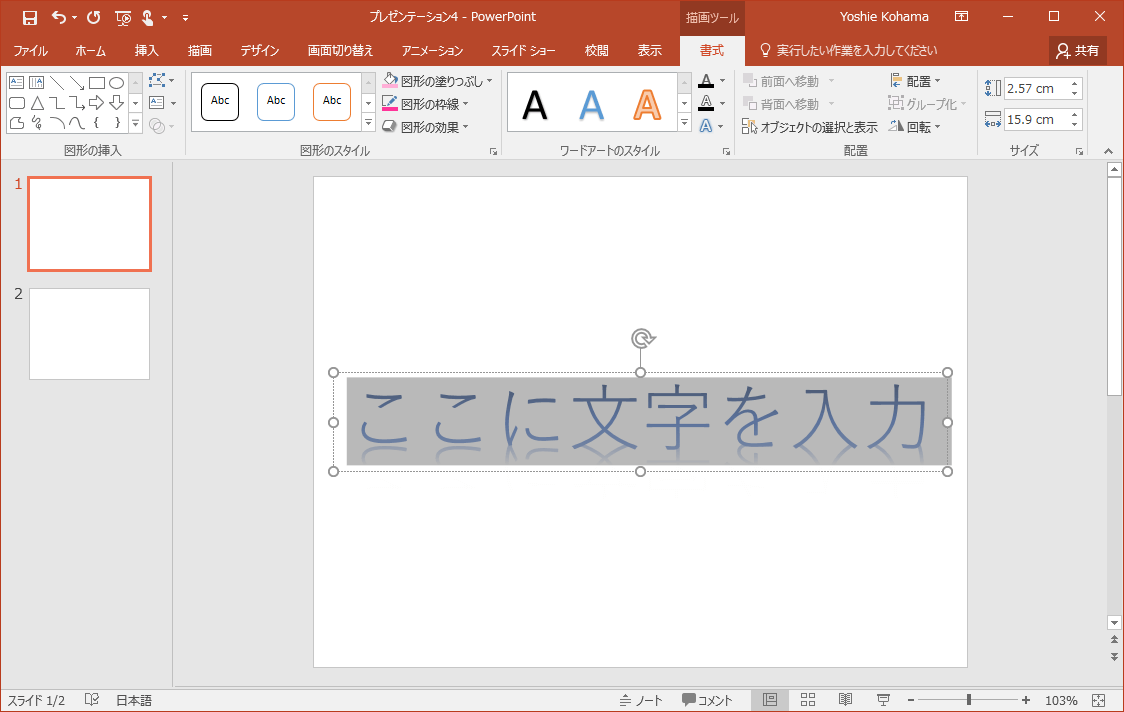 PowerPoint 2016のワードアートテキストボックスを使って、プレゼンテーションに装飾を加えるには、[挿入]タブの[テキスト]グループの[ワードアート]をクリックして、一覧からワードアートのスタイルを選択し、文字を入力します。
