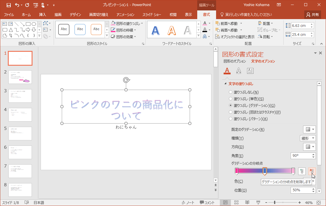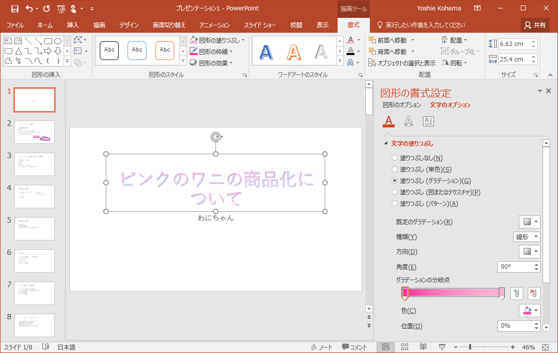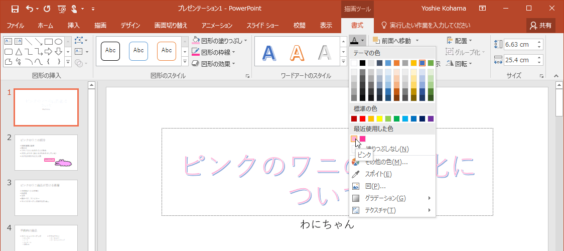 PowerPoint 2016でワードアートを選択して[描画ツール]の[書式]タブを開き、[ワードアートのスタイル]グループの[文字の塗りつぶし]の▼をクリックして、一覧から色やグラデーション、テクスチャを選択します。