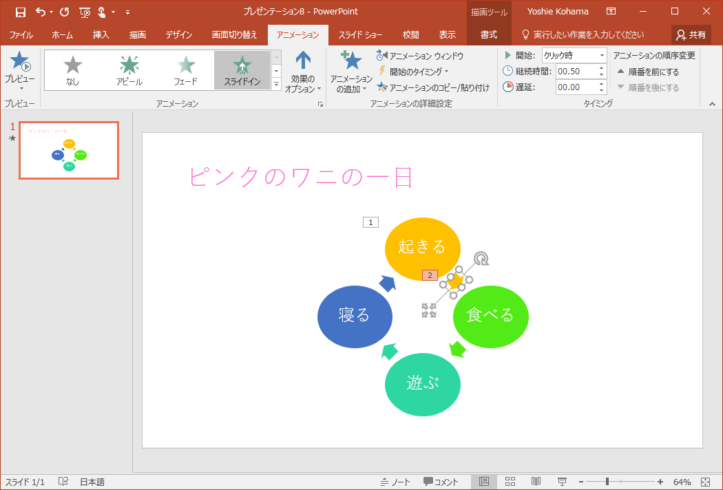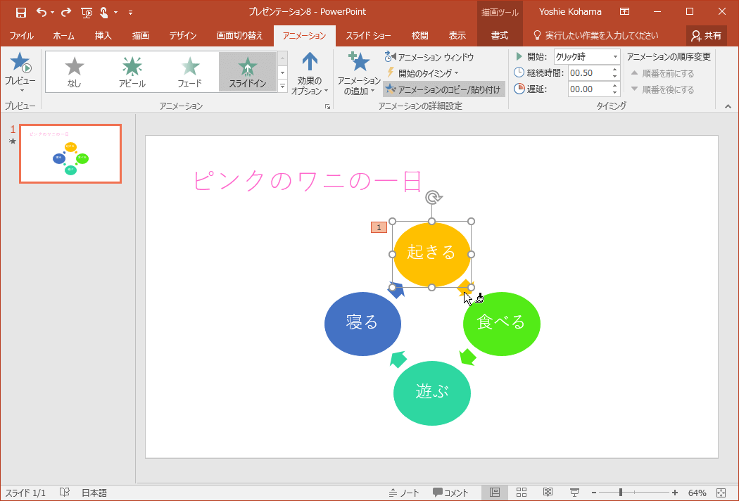 PowerPoint 2016で既存のアニメーションを他の図形に貼り付けることができます。アニメーションが適用された図形を選択して、[アニメーション]タブの[アニメーションをコピー/貼り付け]を選択して、貼り付け先の図形を選択します。ショートカットキーは Alt+Shift+C です。連続してアニメーションを貼り付けたい場合は、[アニメーションのコピー/貼り付け]をダブルクリックします。