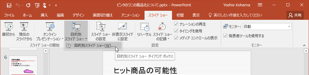 - [スライドショー]タブを開き、[目的別スライドショー]をクリックして[目的別スライドショー]をクリックします。