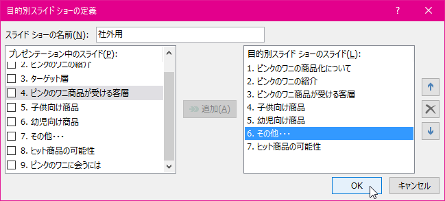 - [目的別スライドショーの定義]ダイアログボックスの[スライドショーの名前]には任意の名前を指定します。