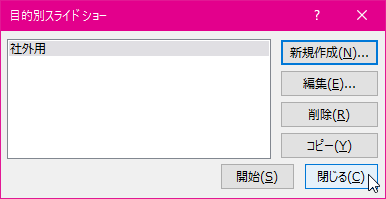 - 目的別スライドショーを作成できたら[閉じる]ボタンをクリックします。