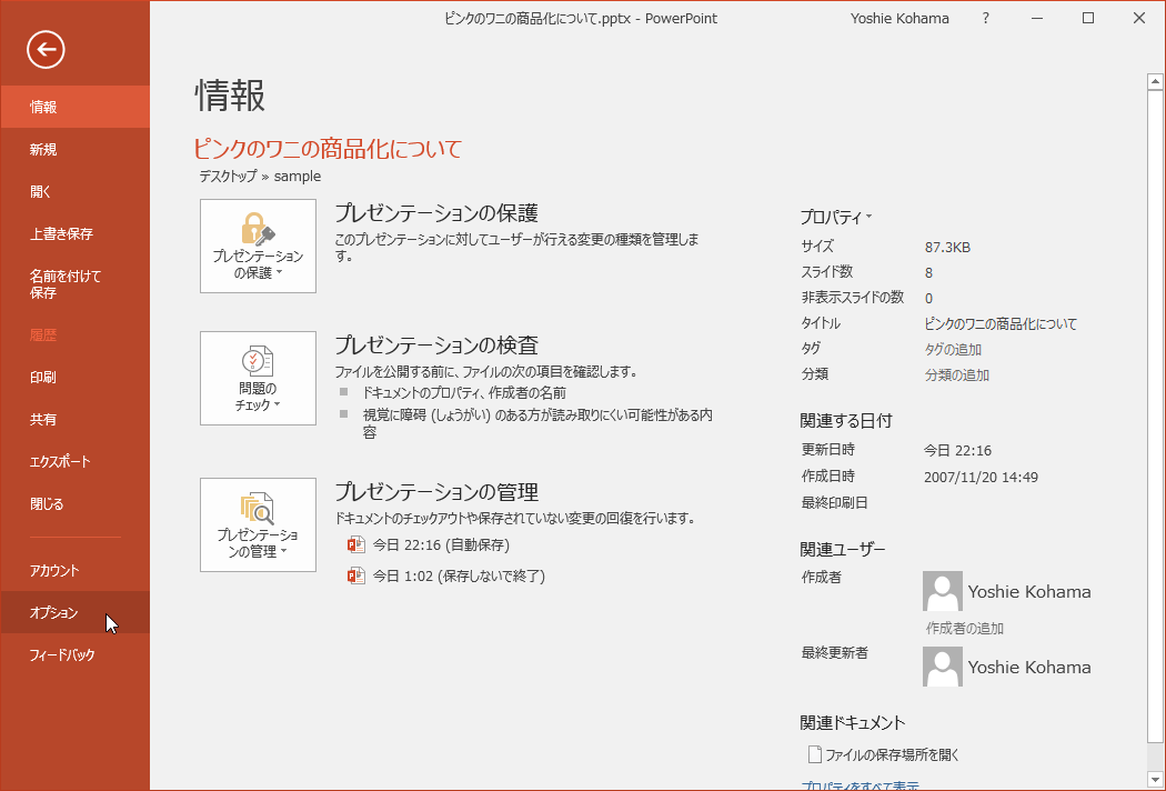 - [PowerPointのオプション]ダイアログボックスの[文章校正]タブを開きます。