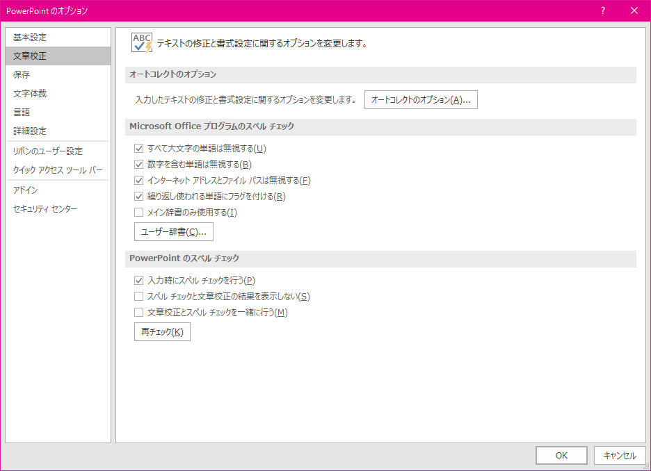 PowerPointに限らず、Microsoft Office のすべてのアプリケーションに適用されるスペルチェックの設定オプションは以下の通りです。