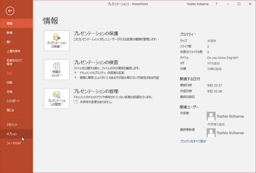 - [ファイル]タブを開き、[オプション]をクリックします。