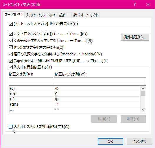 - [入力中にスペルミスを自動修正する]のチェックを外して[OK]ボタンをクリックします。