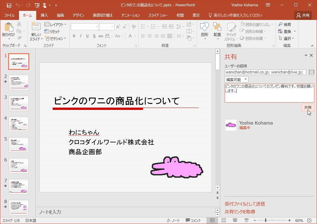 OneDriveに保存したプレゼンテーションを共有するために、PowerPoint 2016で他のMicrosoftアカウントユーザーを招待するには、[共有]作業ウィンドウで名前または電子メールアドレスを入力し、メッセージを入力します。