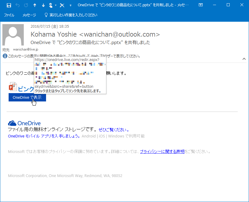 - 招待メールにある[OneDriveで表示]をクリックします。