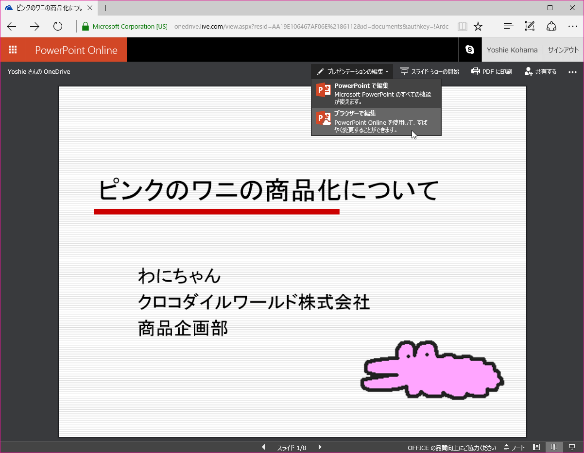 他のMicrosoftアカウントユーザーからの招待メールが来た場合、[OneDriveで表示]ボタンをクリックして、[ブラウザーで編集]をクリックします。PowerPoint Onlineでプレゼンテーションを直接編集できるので、PowerPoint 2016を持ってなくても大丈夫です。